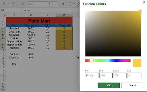 Note: Coloring the input fields can be helpful for those who will use the spreadsheet. In this case we marked the input fields with the yellow color: ffcb05.