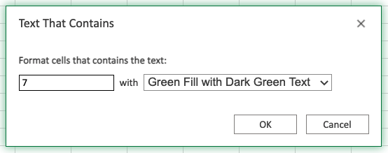 Now, the cells with values That Contains "7" anywhere will be highlighted in green: