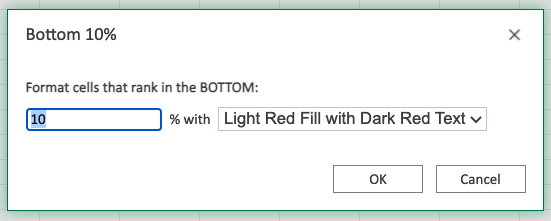 The "Top 10%..." and "Bottom 10%..." rules will highlight cells with one of the appearance options based on the cell value being the top or bottom percent of values in a range.
