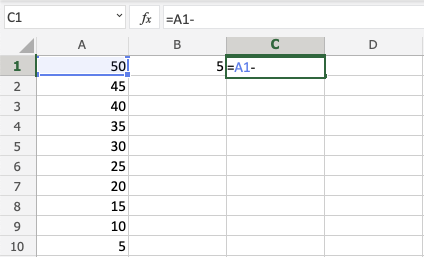 You got it! You have successfully used absolute reference to subtract B1(5) from the minuend range A1:A10.