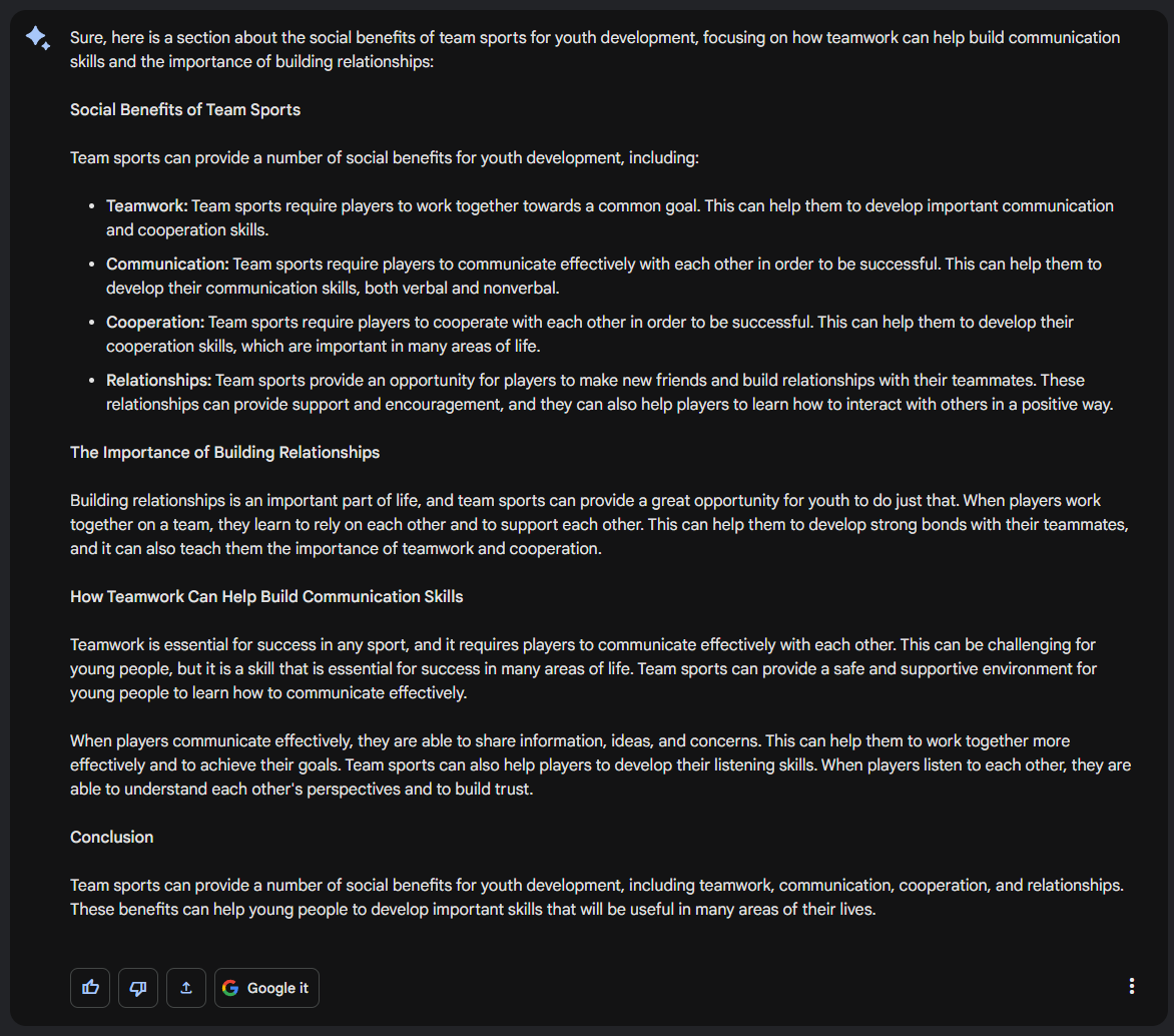 In our example, we will use the text 'For an article about "The importance of team sports for youth development", write a section about xyz' as a starting point:
