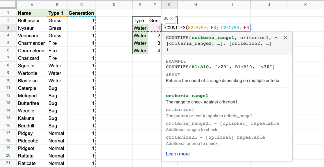 Example COUNTIFS function, step by step: