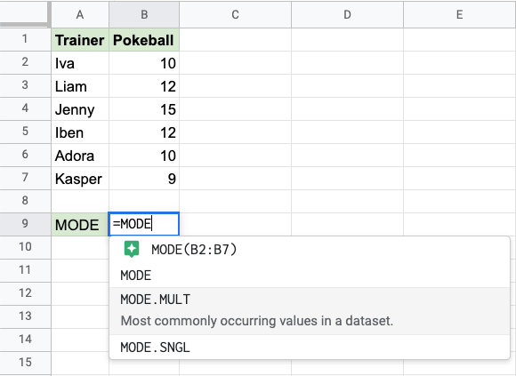 The MODE function is a premade function in Google Sheets, which is used to find the most common value(s).