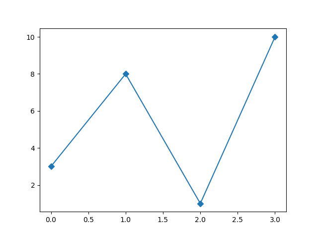 #Three lines to make our compiler able to draw: import sys import matplotlib matplotlib.use('Agg') import matplotlib.pyplot as plt import numpy as np ypoints = np.array([3, 8, 1, 10]) plt.plot(ypoints, marker = 'D') plt.show() #Two lines to make our compiler able to draw: plt.savefig(sys.stdout.buffer) sys.stdout.flush()